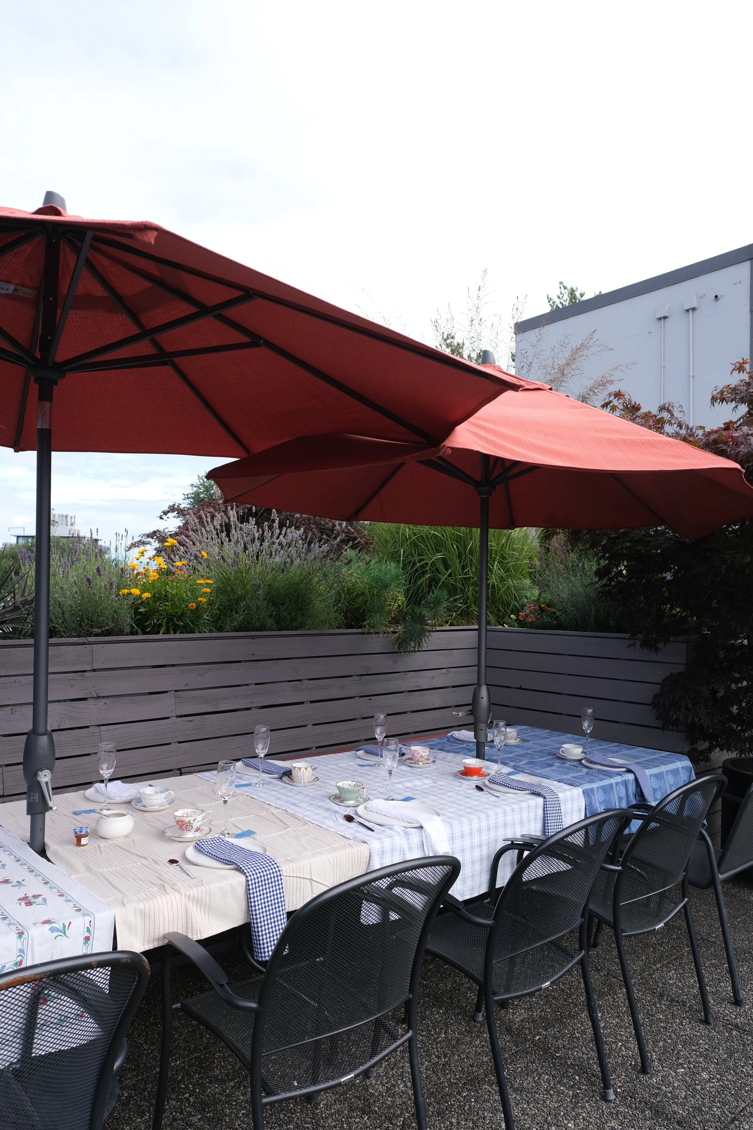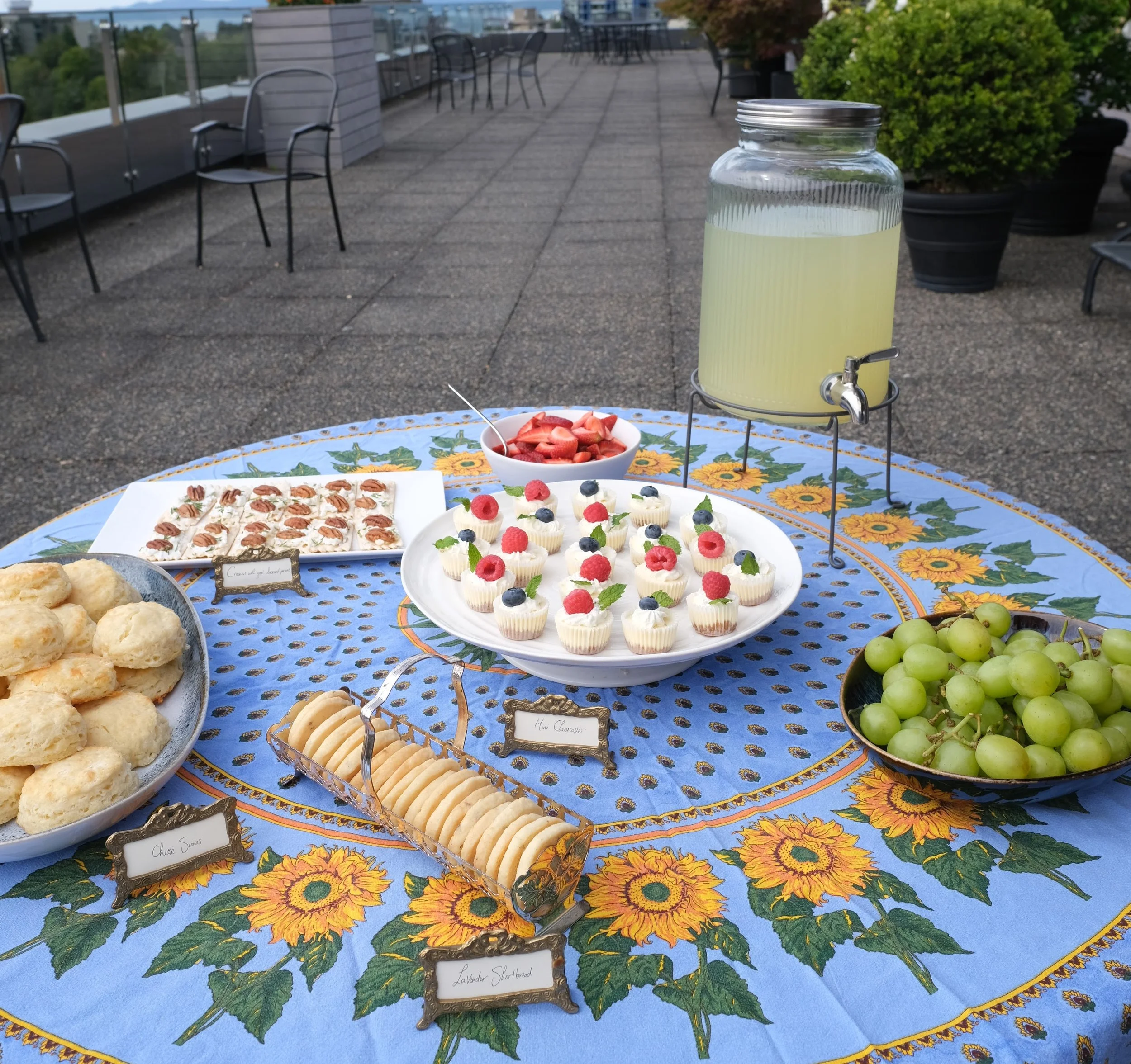 For the shower, my friend Sophie and her mom made a whole bunch of baked goods and we had a small group over on my rooftop deck for tea. It was simple, but lovely. We used table cloths, cloth napkins, dishes and some vintage teacups we already had so there were no disposals and nothing had to be purchased.